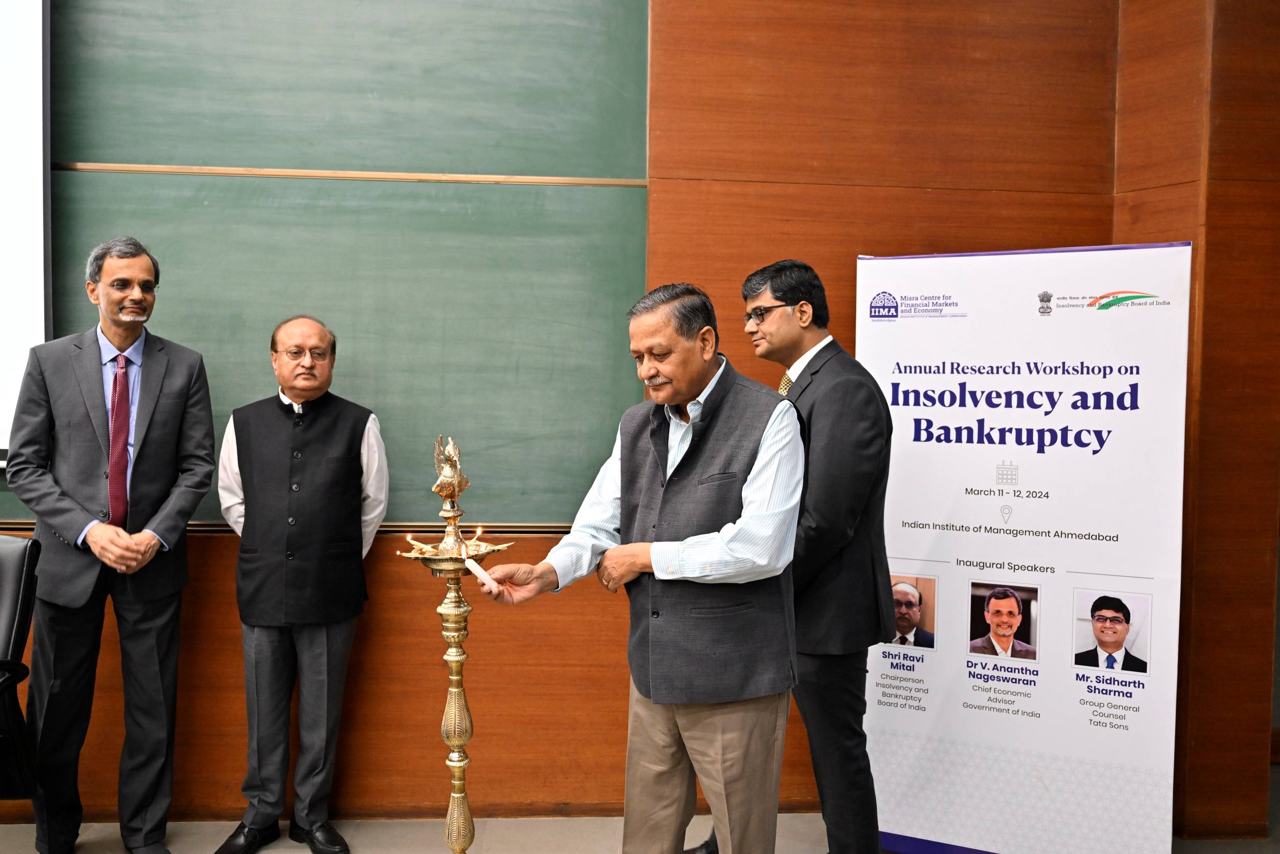 March 13, 2024: The Annual Research Workshop on Insolvency and Bankruptcy – a two-day workshop jointly organised by the Misra Centre for Financial Markets and Economy at the Indian Institute of Management Ahmedabad (IIMA) and the Insolvency and Bankruptcy Board of India (IBBI), concluded on Tuesday. The inaugural session was attended by Professor Bharat Bhasker, Director, IIMA; Dr V. Anantha Nageswaran, Chief Economic Advisor, Government of India; Mr Ravi Mital, Chairperson, IBBI, Government of India, and Mr Siddharth Sharma, Group General Counsel, Tata Sons, alongside faculty and staff members at IIMA.